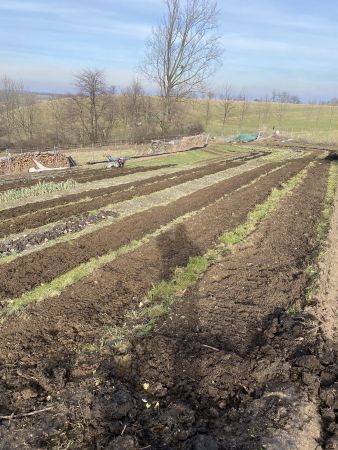 Aufgrund des "warmen" Wetters für diese Jahreszeit haben wir am gestrigen trockenen Tag die Beete der Parzelle 3 zum bepflanzen vorbereitet. Die Erde aus unserer Mistplatte und die nach der Bodenanalyse fehlenden Mineralien sind aufgebracht und eingearbeitet. Da unser erster Satz Dicke Bohnen Jungpflanzen fertig ist geht es knapp 2 Wochen früher als geplant ins Freiland.