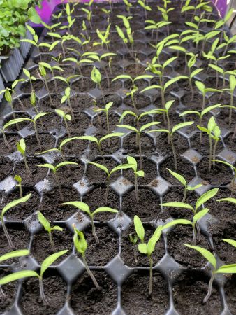 Die ersten 500 bis 600 der am 20.02. ausgesäten Tomaten werden jetzt zum ersten mal umgetopft. Um Kunststoff zu reduzieren pflanzen wir in Töpfe aus natürlichen Rohstoffen, die dann einfach beim nächsten umtopfen mit eingesetzt werden und dann in der Erde verrotten.