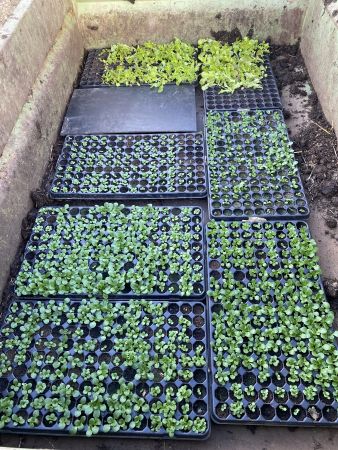 Zum neuen Jahr: 6*144 Quickpot Feldsalat und 2*144 Quickpot Eichblatt aus Anzucht November ins Gewächshaus.