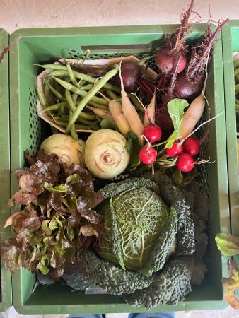 Mit Wirsing, Rote und Gelbe Beete, Radischen rot, Radischen Eiszapfen, Bohnen, Salat, Kohlrabi und Kartoffeln