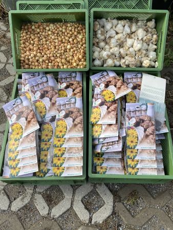 Dieses Jahr können wir die kommende Saison besser vorbereiten. Wir pflanzen jetzt noch Winterknoblauch und -Zwiebeln sowie zum ersten Mal Tobinambur für die Ernte 2024.