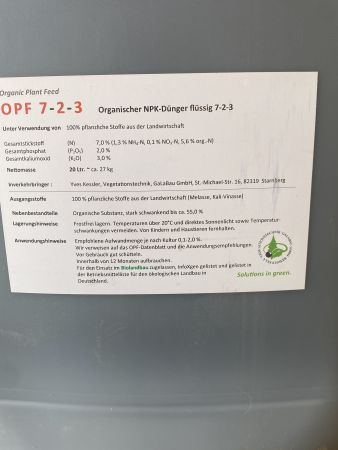 Damit unsere Jungpflanzen nach dem Aussetzen gut anwachsen, wässern wir die Pflanzen mit OPF 7-2-3 Dünger (7% Stickstoff, 2% Phosphat und 3% Kaliumoxid) Die Düngung sorgt für eine schnelle Wurzelbildung. Dazu dann, je nach Kultur, alle 3 Wochen als Blattdüngung eingesetzt, sorgt für besseres Wachstum. Ist zu 100 % pflanzlich und für den ökologischen Anbau zugelassen. Aufwandsmenge 0,1 bis 2 % mit Wasser verdünnen je nach Kultur. Geht natürlich auch für den privaten Bereich. Wir haben für die Saison vorerst 40 Liter gelagert. Kann dann auch in kleineren Mengen im Hofladen erworben werden.